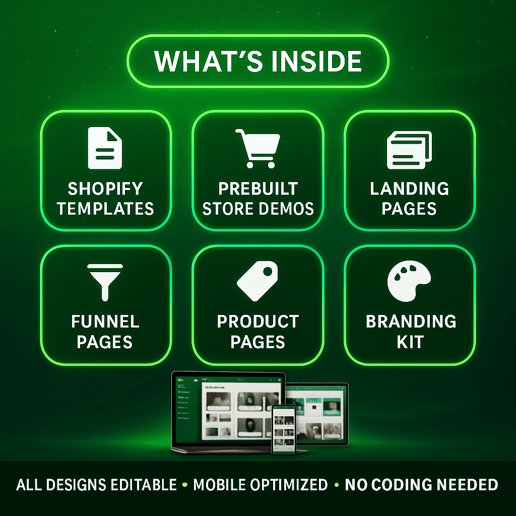 Most people get stuck building Shopify sites from scratch. This bundle breaks that barrier by giving you done-for-you store templates, product pages, and site kits — all customizable and ready to launch or resell.