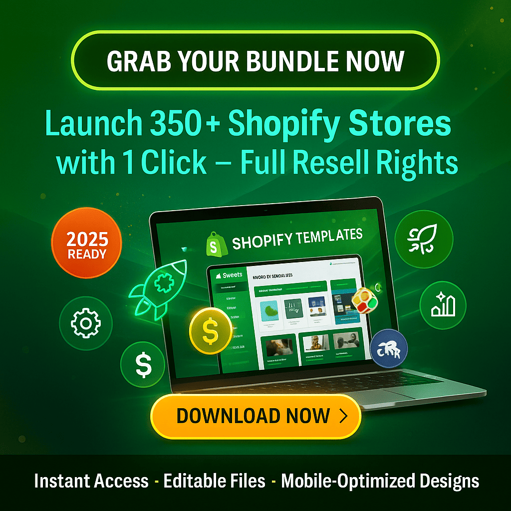 Launch your online store or digital product business faster than ever with this massive Shopify bundle. Whether you’re building for yourself or clients, the 350+ Premium Shopify Pack gives you plug-and-play design power with full resell rights.